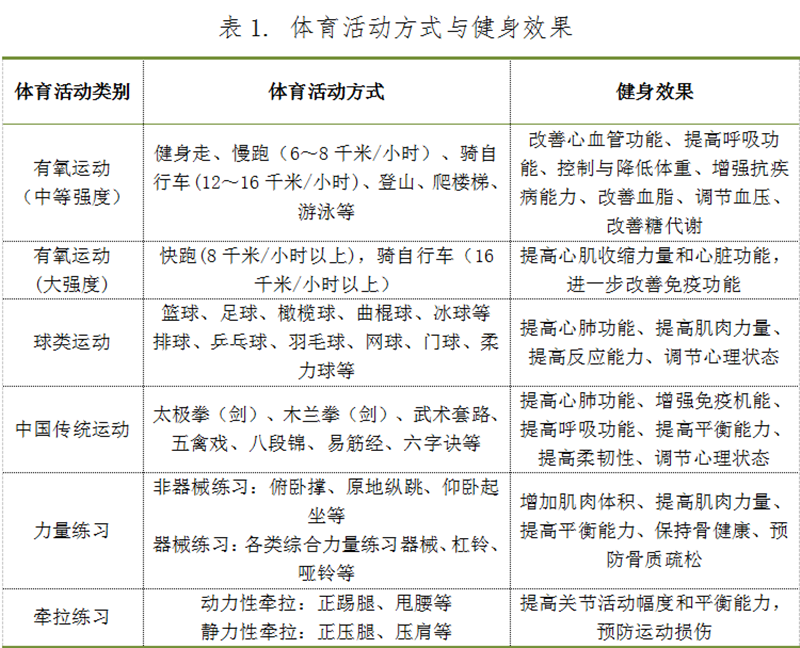 不同体育活动方式的健身效果见表1。