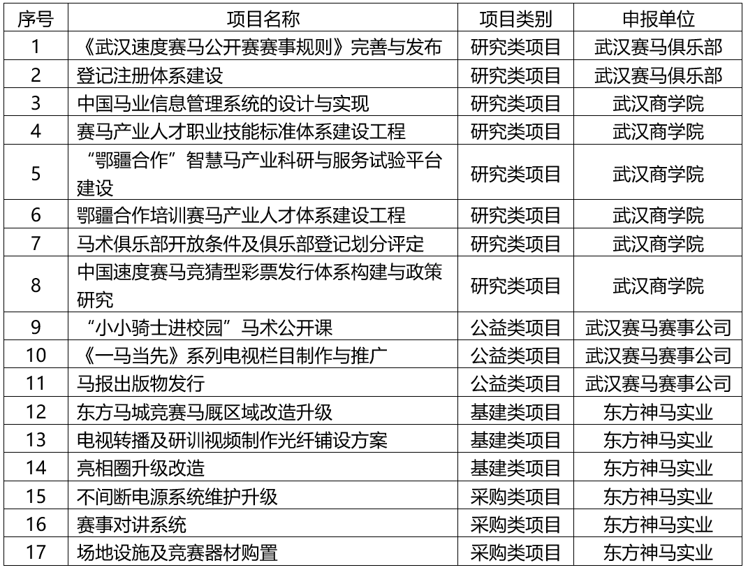 2019年武汉市马产业专项资金申报项目材料经过专家评审,拟准予17个申报项目立项,具体名单如下: