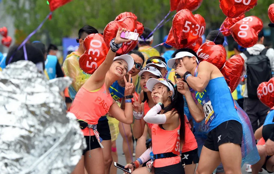 ▲2019年的武汉马拉松起跑现场,跑友在拍照留念。