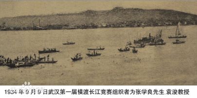 1934年9月9日,由体育界和军界人士发起了武汉第一次横渡长江游泳竞赛活动,全程5000米,有44人参加,张学良将军为冠军颁赠银盾“力挽狂澜”。