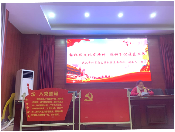 12月3日,市体育局机关党支部与对口联系的武昌区白沙洲街长江紫都社区党支部共同开展12月主题党日活动,市体育局副局长、机关党委书记颜璠讲“弘扬伟大抗疫精神, 做好下沉社区工作”党课,机关党委专职副书记洪旭艳同志作学习交流发言,参会党员一起重温入党誓词,诵读《中国共产党章程》,深入学习贯彻党的十九届五中全会精神,推动全会精神走向社区、走进群众。