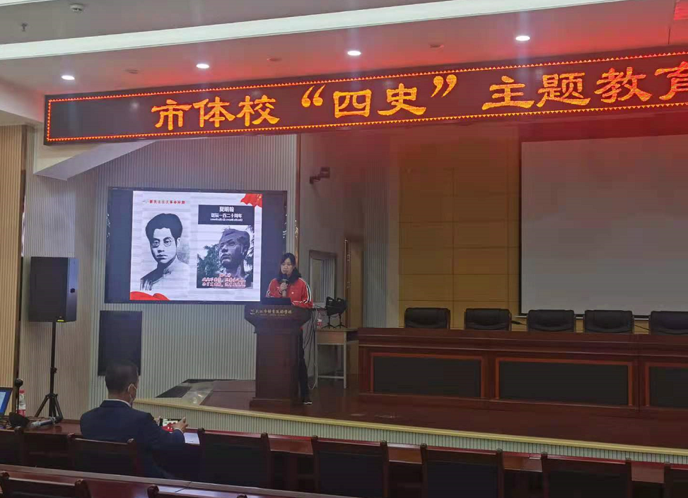 4月16日上午,武汉市体育运动学校开展“学四史”系列主题教育活动第一课:中国共产党党史教育。本次课程由党员教师朱晓蕊主讲,授课主题为《百年征程,初心如磐》,采取线上线下同步授课的方式,线上课堂面向全校、全体育局开放。