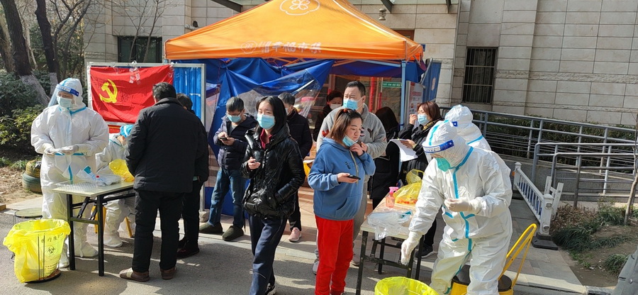 图为:局机关党员干部下沉武昌区白沙洲长江紫都社区“管控区”开展全员核酸检测