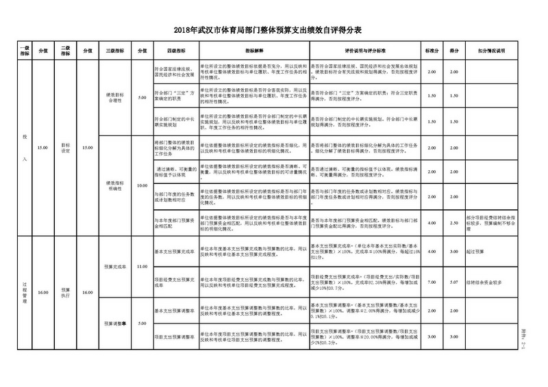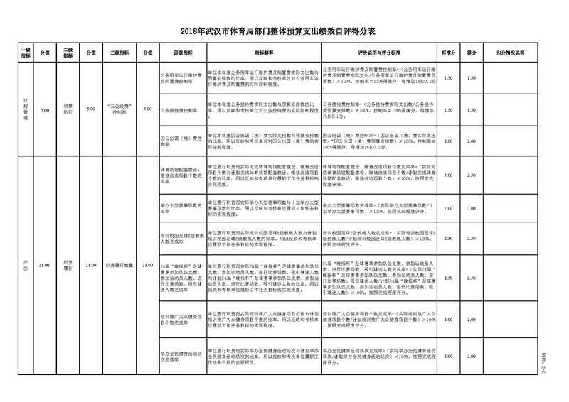 按照财政部《关于印发<财政支出绩效评价管理暂行办法>的通知》(财预〔2011〕285号)给出的评价指标体系及分项分值,根据市体育局实际完成情况考评结果,投入指标得分为13.50分,过程管理指标得分18.07分,职责履行得分31.88分,履职效果得分29.00分,合计92.45分。详见附表3。